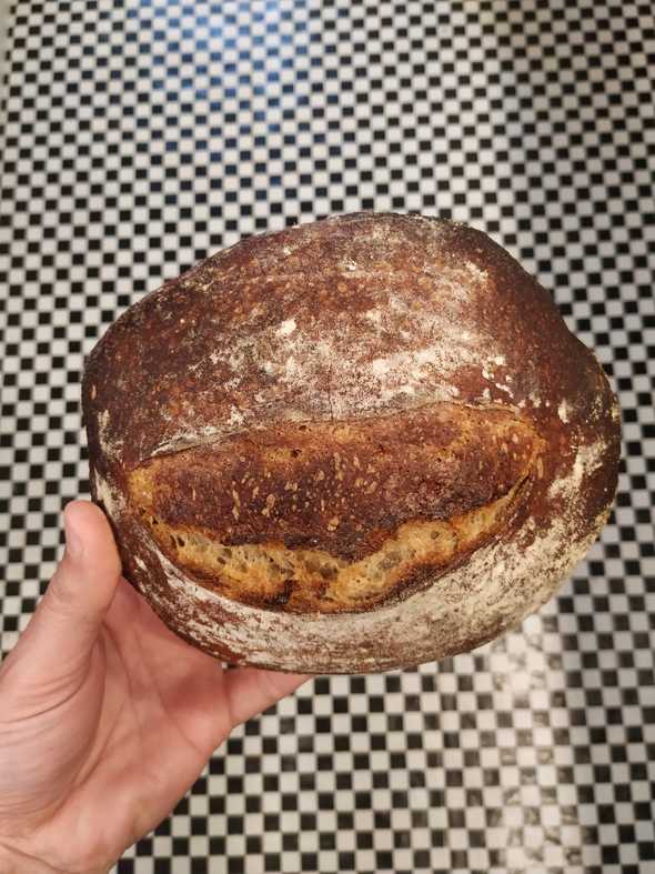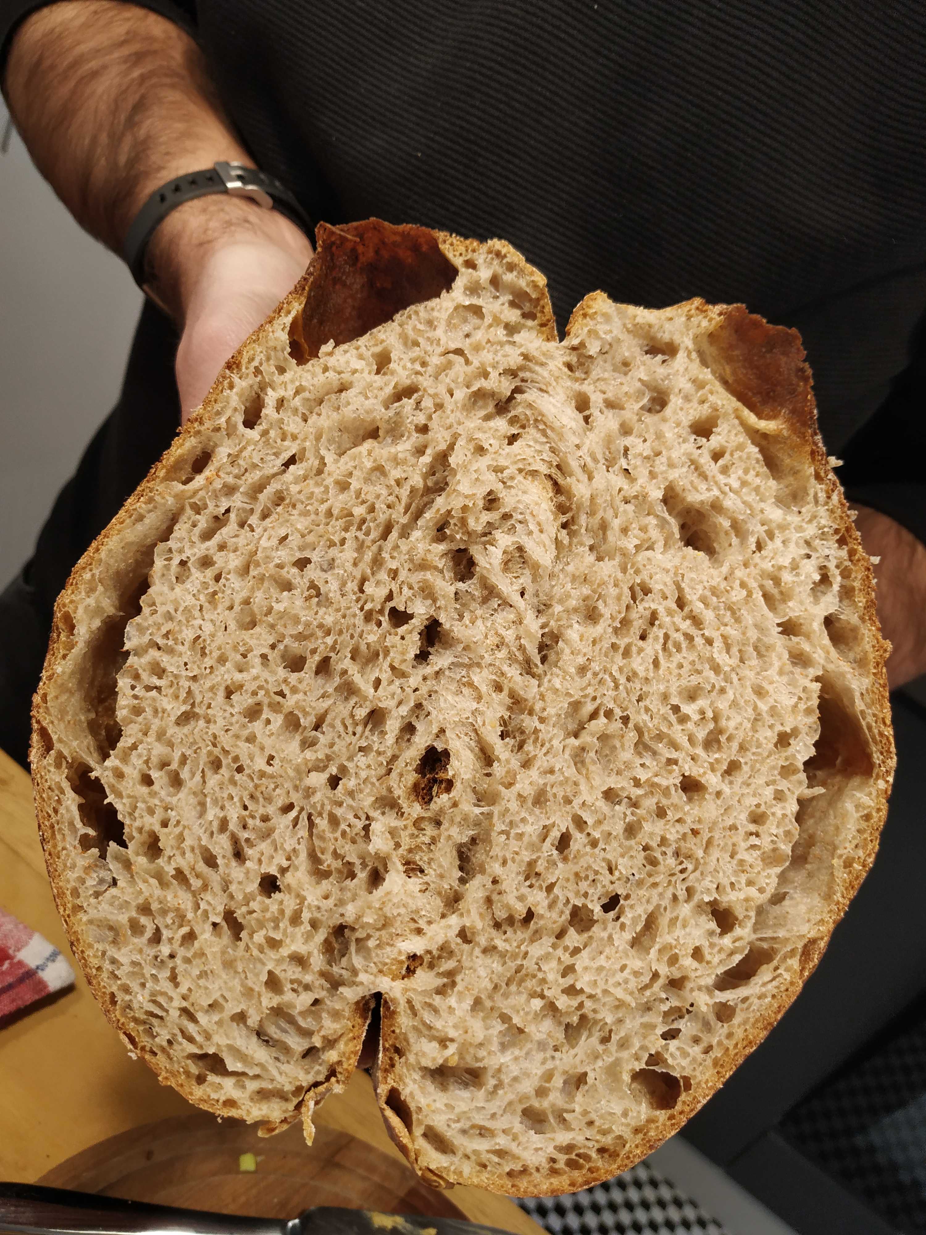 El grande quedó como es habitual, corteza fina y crocante (no le hice el tajo de arriba porque el señor de la receta no lo hace y quién soy yo para discutir, además quedan lindos redonditos, se nota la burbuja de arriba en la primera foto), de lo mejorcito que he hecho. Los chicos quedaron bien, corteza mucho más gruesa, pero a estos sí les hice un tajo (porque me pareció nomás) y quedaron como sonriendo. La ventaja de los chicos es que son más fáciles de guardar o regalar.